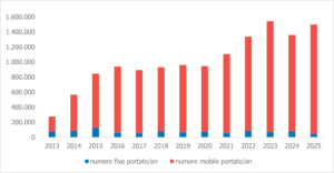 In ceea ce priveste telefonia fixa, in 2025 au fost portate 44.121 de numere, majoritatea fiind transferate catre Orange (17.568), Digi Romania (11.379) si Vodafone (5.661).