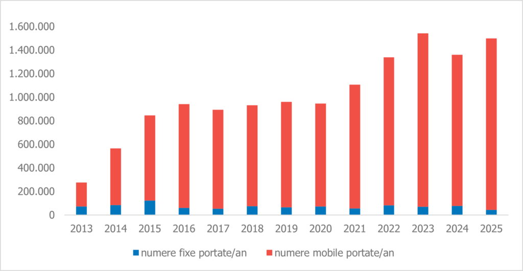 În ceea ce privește telefonia fixă, în 2025 au fost portate 44.121 de numere, majoritatea fiind transferate către Orange (17.568), Digi Romania (11.379) și Vodafone (5.661).